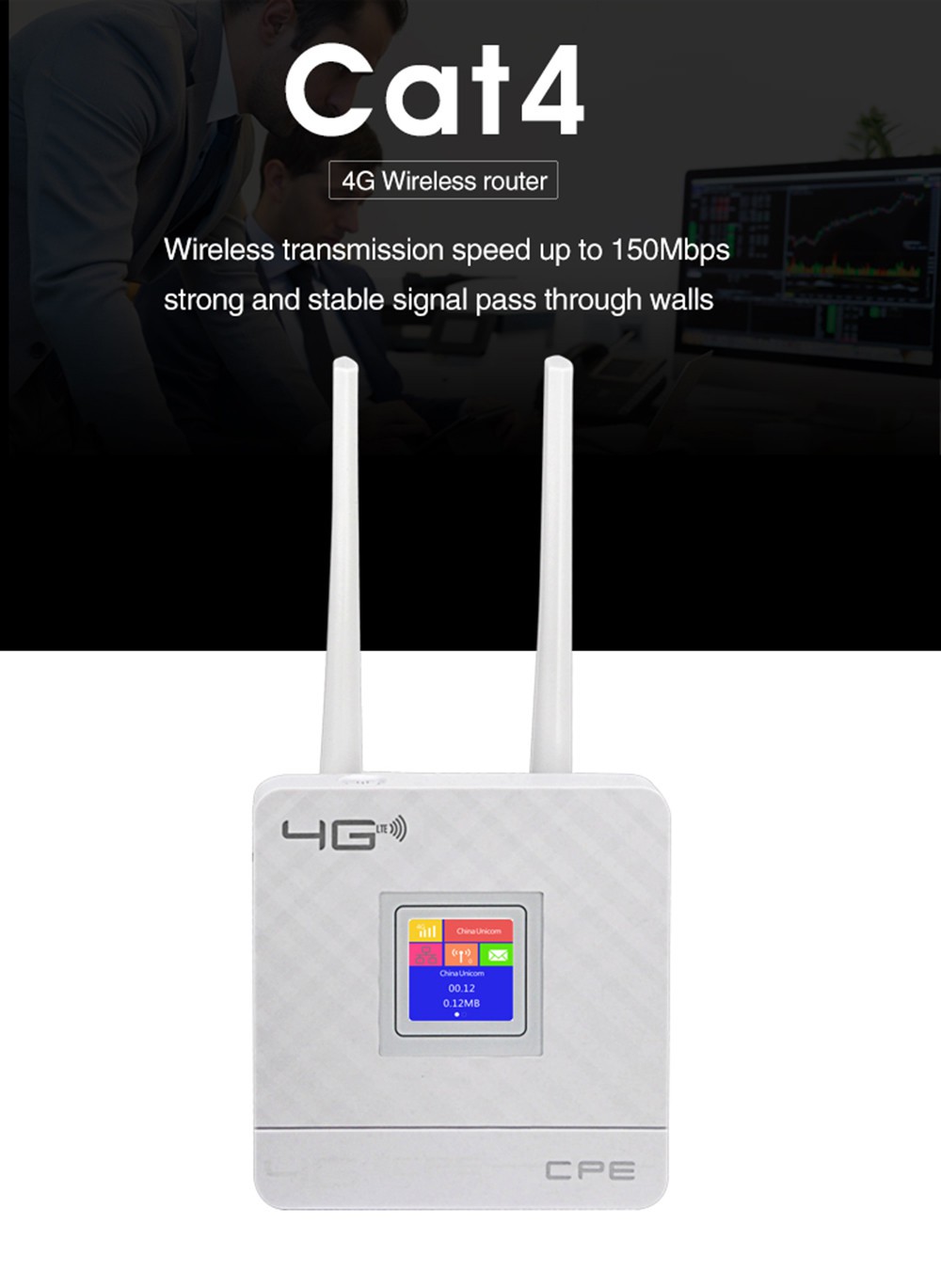 CPE903은 4G SIM 카드 슬롯과 MIPS 네트워킹 프로세서가 있는 고출력 4G 무선 라우터로 엔터프라이즈, 홈, 회사, 사무실의 Wi-Fi 네트워킹을 위한 솔루션입니다. IEEE 802.11b/g/n 표준과 호환되는 데이터 속도는 300Mbps에 도달합니다. 듀얼 외부 안테나를 사용하면 Wi-Fi 신호가 더 안정적이고 더 긴 범위입니다. 10명의 Wi-Fi 사용자를 동시에 지원합니다.