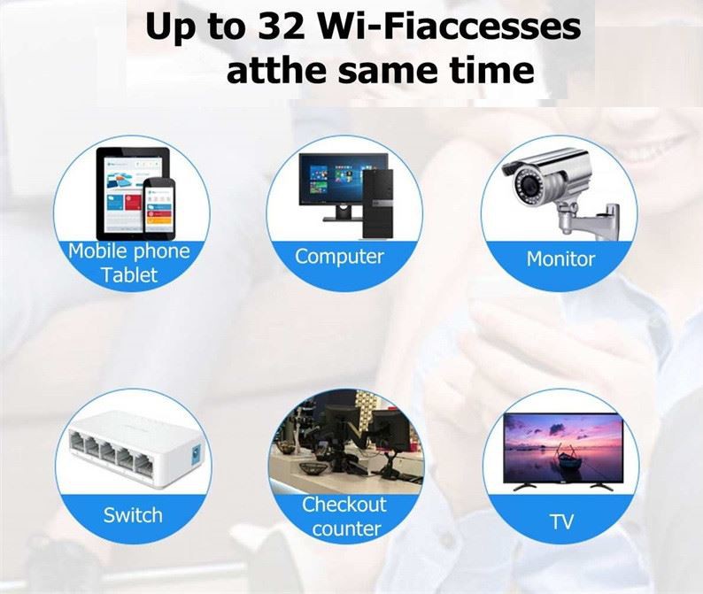 최대 32개의 WiFi에 동시에 액세스할 수 있습니다. 4G 라우터가 WiFi를 전송하는 동안 네트워크 케이블로 컴퓨터, 모니터, 스위치, 금전 등록기, 텔레비전 및 기타 장비를 동시에 연결할 수도 있습니다.